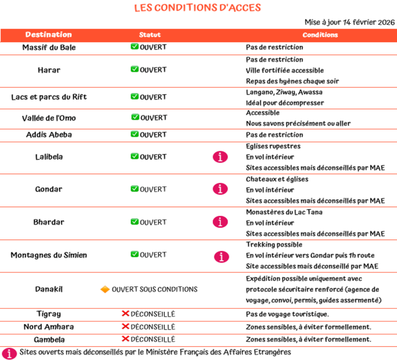 Par responsabilité, nous déconseillons encore actuellement les voyages dans certaines régions du Nord (comme le Tigray y compris Axum et certaines parties de l’Amhara) ainsi que dans certaines zones de l’Ouest vers Gambela. Cette transparence est la base de notre relation avec vous.
